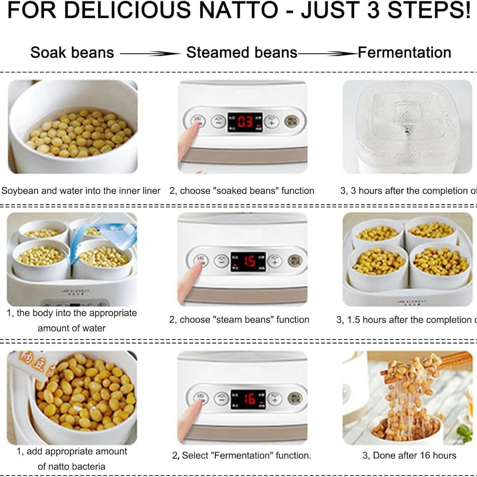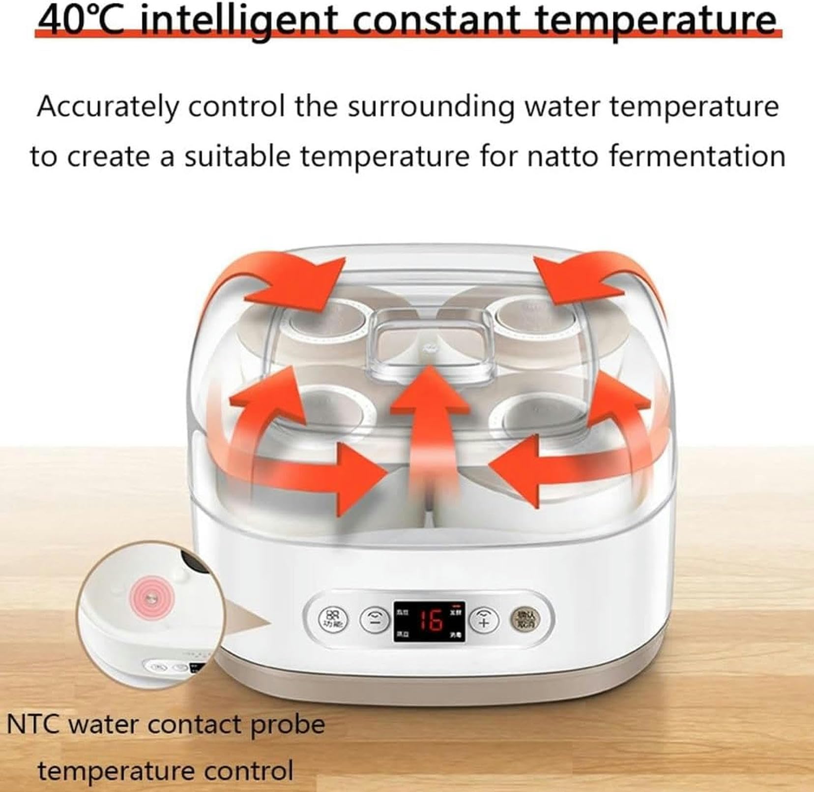 Control de temperatura preciso: tecnología de sonda táctil de agua NTC, con temperatura constante de 40 °C para una fermentación óptima de natto.