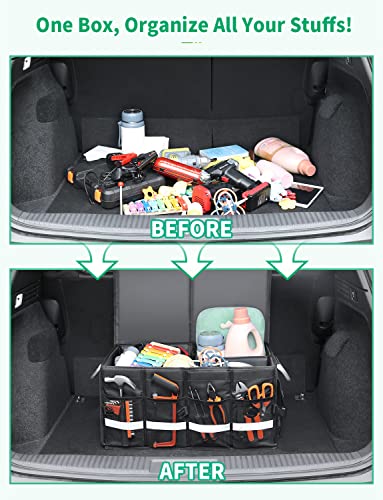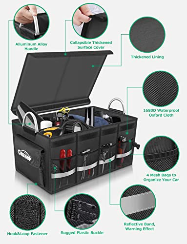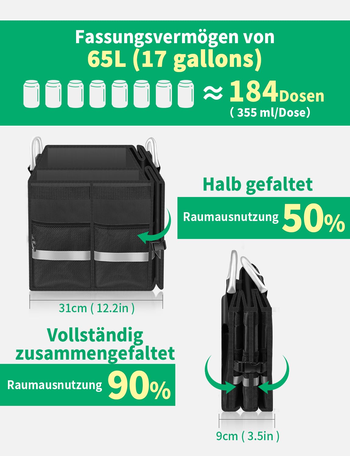 Bandas reflectantes: Los reflectores de neón en la caja del maletero proporcionan mayor visibilidad y seguridad durante la carga y descarga nocturnas. Gran capacidad de 65 L: En 2023, reforzamos el asa de aluminio del organizador de maletero con tres capas de costura de precisión. Soporta una carga de 50 kg, así que ya no tendrá que preocuparse por roturas.